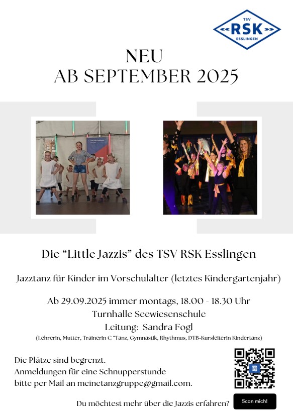 Wir freuen uns sehr, dass wir ab September 2025 eine neue Gruppe anbieten können. Die Gruppe "Little Jazzis" ist für Kinder im Vorschulalter (Schuleintritt zum Schuljahr 2026/27).