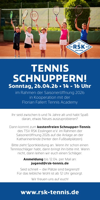 Freude am Tennis. In einem Verein für die ganze Familie. Und das alles auf einer herrlichen Anlage, hoch oben über der Stadt. Tennis beim TSV RSK Esslingen ist mehr als nur Spiel, Satz und Sieg. Tennis beim TSV RSK ist ein Gefühl. Bei uns spielen Anfänger:innen neben Leistungssportler:innen, Familien neben Student:innen und Senior:innen neben Kindern. Neugierig geworden? Alle Infos gibt’s hier: