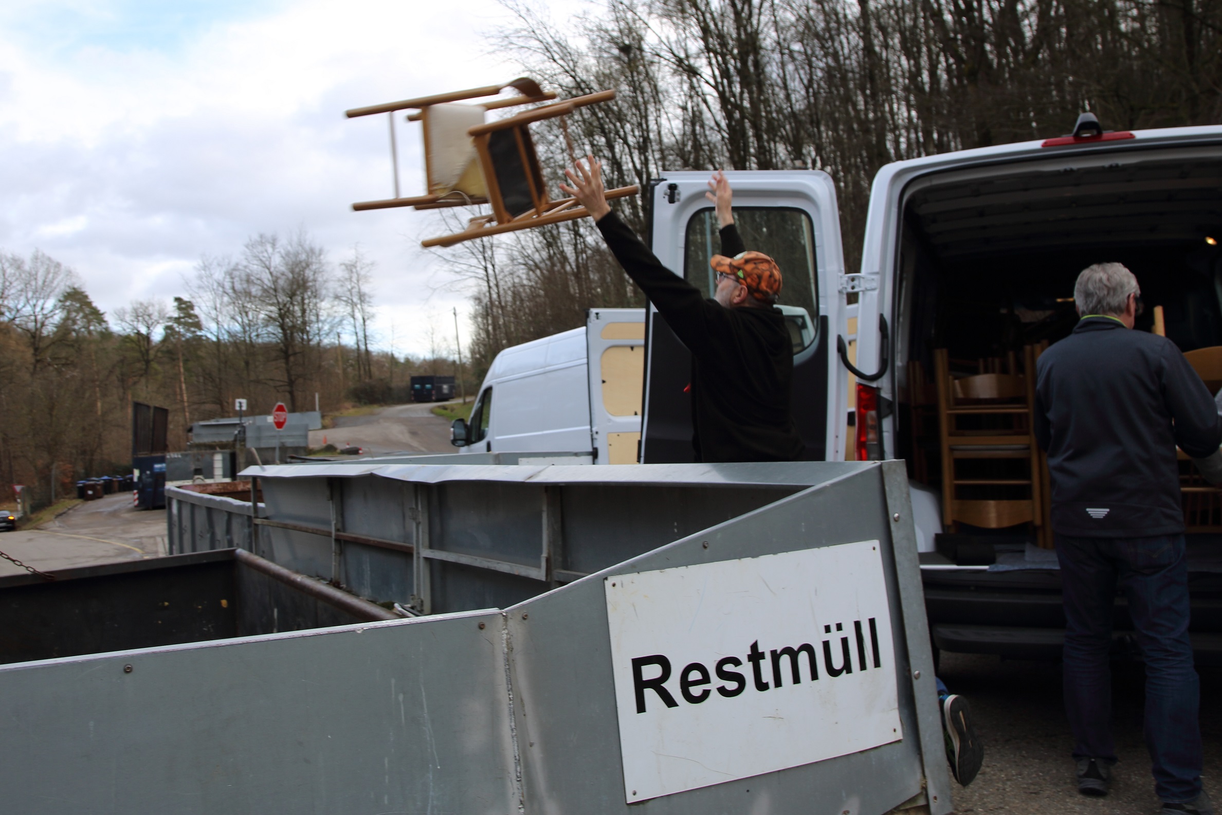 Auf der Deponie Katzenbühl waren die Leichtathleten im Skiteam gefragt. Unter Beobachtung von Trainer Jörg flogen die alten Stühle in gekonnter Stoßbewegung in den Container.