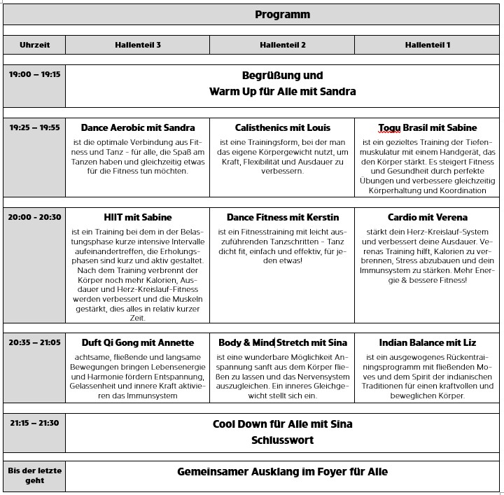 Unsere Gruppen Ladies Power, Jazztanz und Fit & Play haben ein abwechslungsreiches, fast zweistündiges Programm für euch auf die Beine gestellt. Du entscheidest, wo du mitmachen möchtest und wie sehr du dich auspowerst!