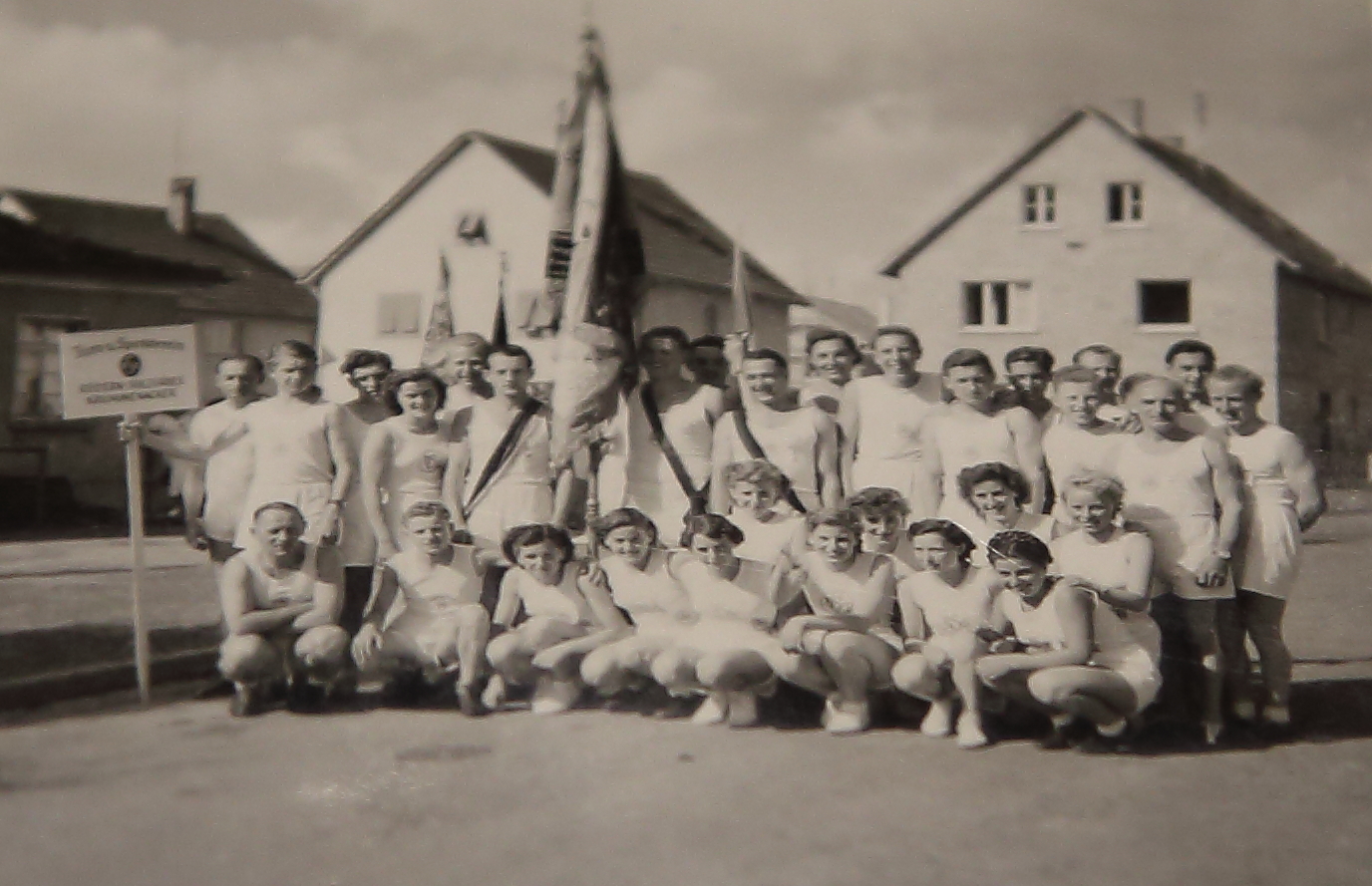 Irene war auch bei der Einweihung des Sportplatzhauses am 21.8.1949 dabei. Es wurde mit einem gemeinsamen Kinderfest mit dem Musik-, Radfahr-, und dem Gesangsverein begangen.