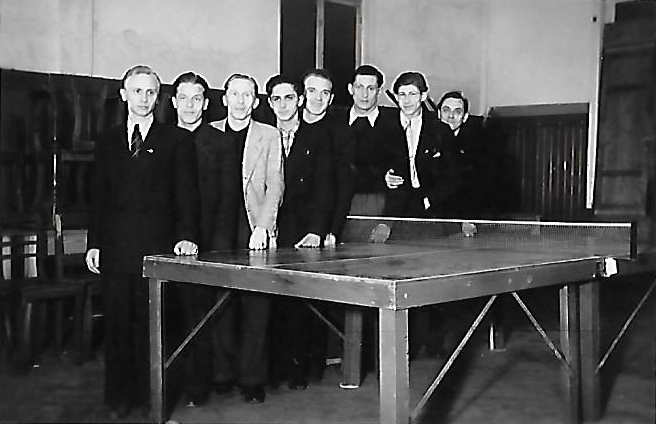 Die TT-Spieler 1951 von li nach re: Walter Weiß, Gottlob Alt, Martin Zund, N.N., N.N., Jonny ? (FB), Rolf Bulling, Willi Birkmann (Abteilungsleiter).