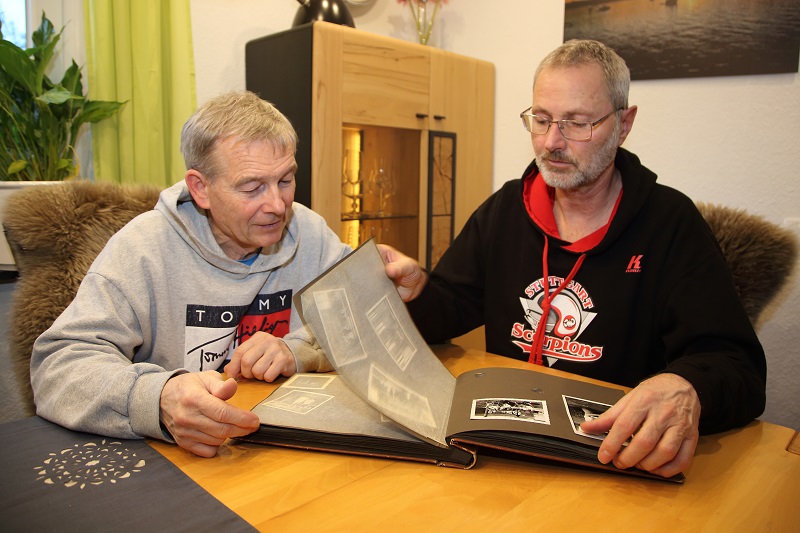 Jörg Stadelmaier und Gerd König blättern im Fotoalbum mit Aufnahmen der Traube in Sulzgries.